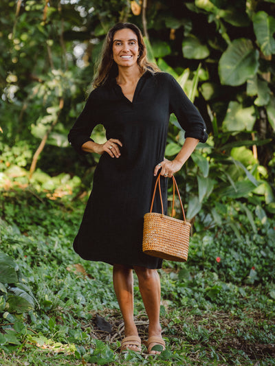 The Holoholo Dress creates flowing, flirty lines with its loose fit. Leave it loose or use the tie to belt for a more figure fitting shape. We recommend ordering your typical size. Want more sizing information? Check out our model sizing page!
