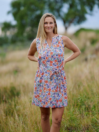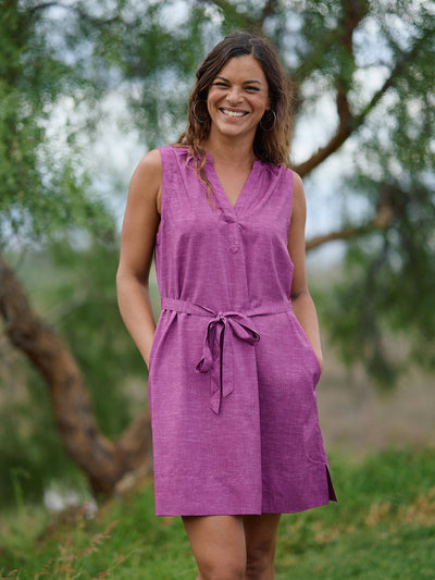 The Holoholo Dress creates flowing, flirty lines with its loose fit. Leave it loose or use the tie to belt for a more figure fitting shape. We recommend ordering your typical size. Want more sizing information? Check out our model sizing page!