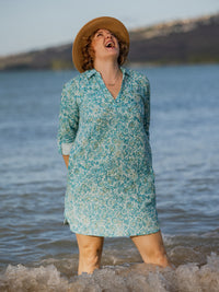The Travel Dress was designed to be relaxed and comfortable with a slightly boxy fit that is breezy, cool, and flattering. If you prefer a closer to body fit we recommend sizing down. Want more sizing information? Check out our model sizing page!