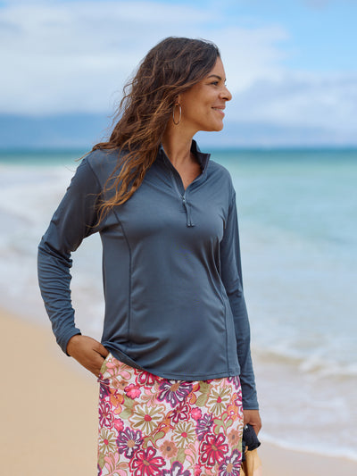 The Half Zip is a relaxed fit so that you can wear it as a cover-up for breezy sun protection. The zip neckline allows for adjustable airflow and the stretch knit fabric (same as our Runaround Dress!) provides UPF 50 protection for all day wear. If you are large-chested or prefer a looser fit, we recommend sizing up. Want more sizing information? Check out our model sizing page!