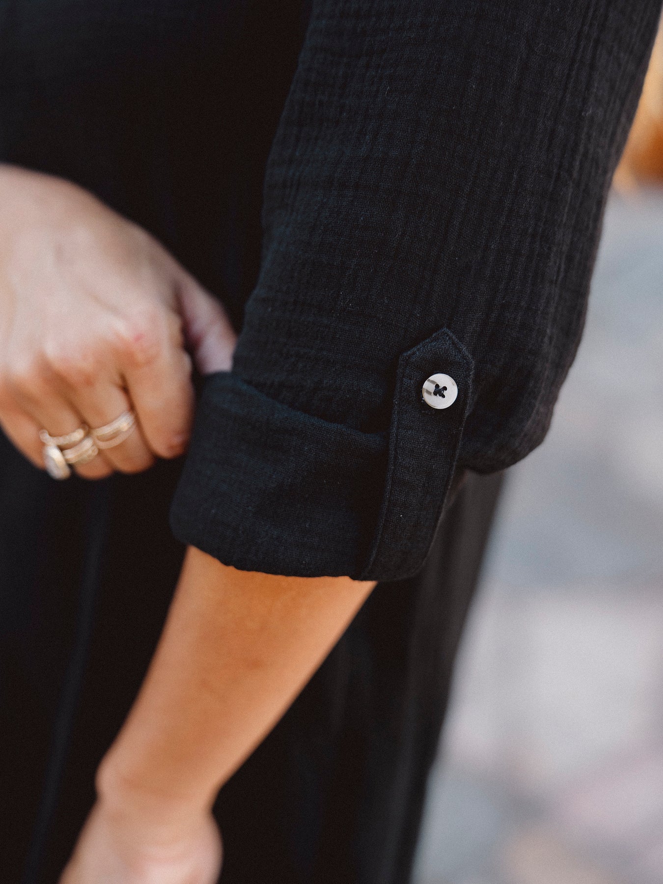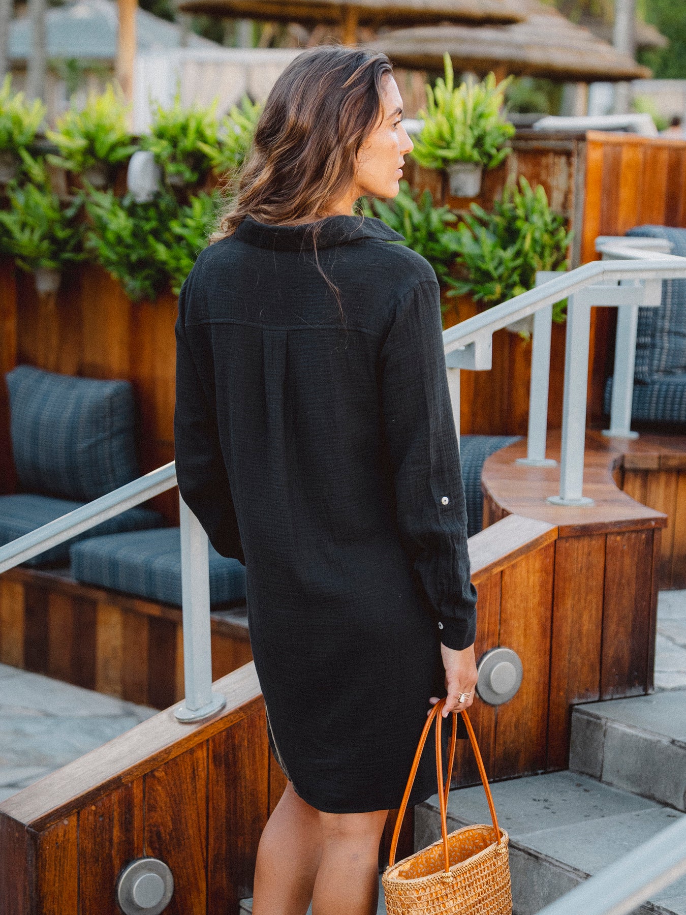 The Travel Dress was designed to be relaxed and comfortable with a slightly boxy fit that is breezy, cool, and flattering. If you prefer a closer to body fit we recommend sizing down. Want more sizing information? Check out our model sizing page!